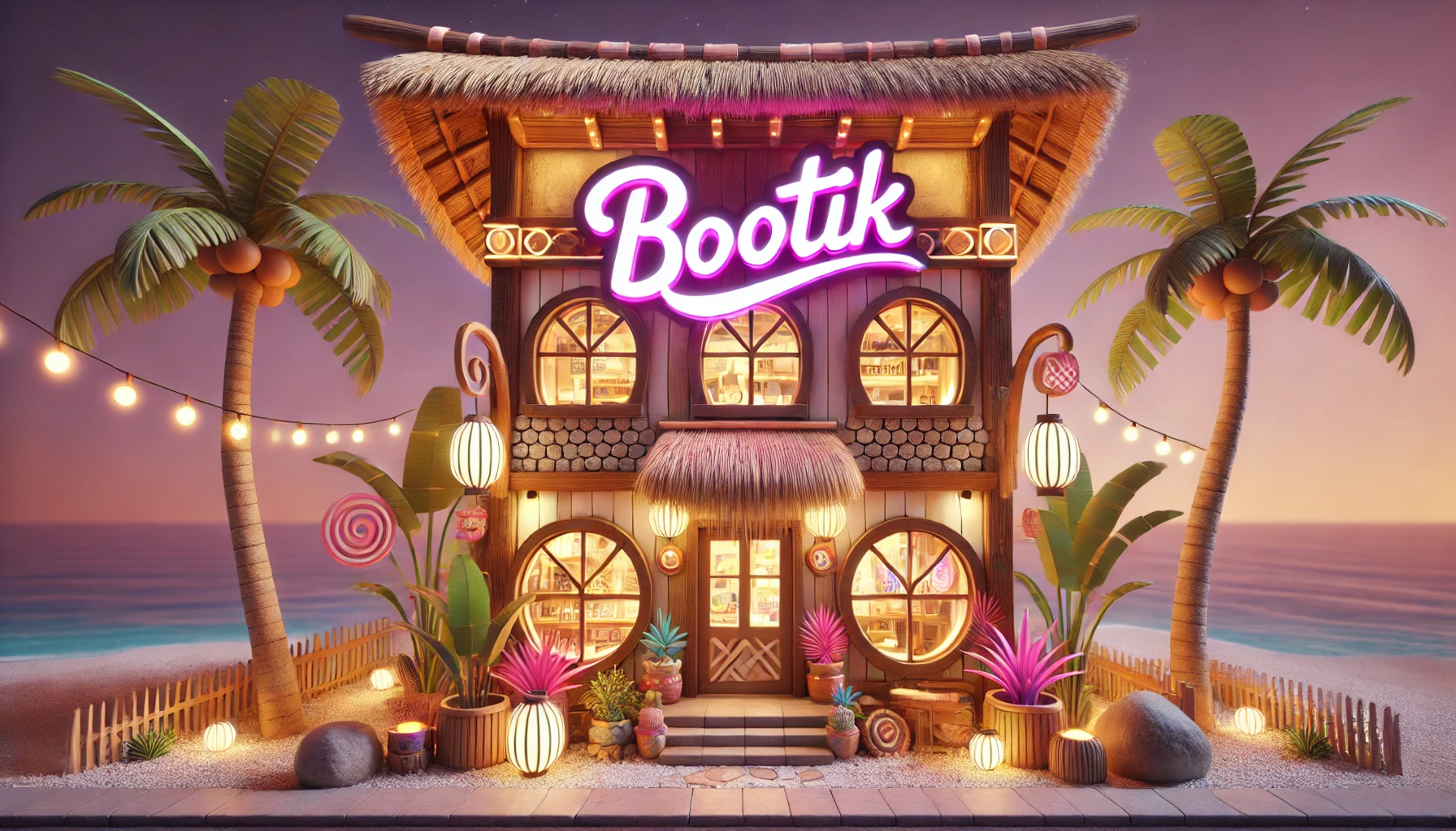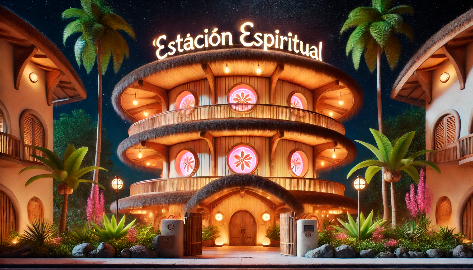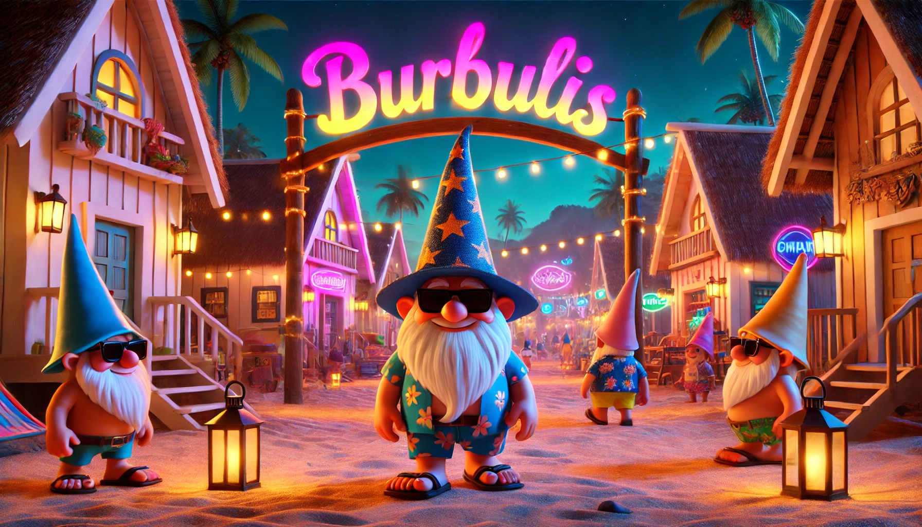 La villa tropical, hogar de los LoomiGnomos, entre aventuras y noches mágicas.